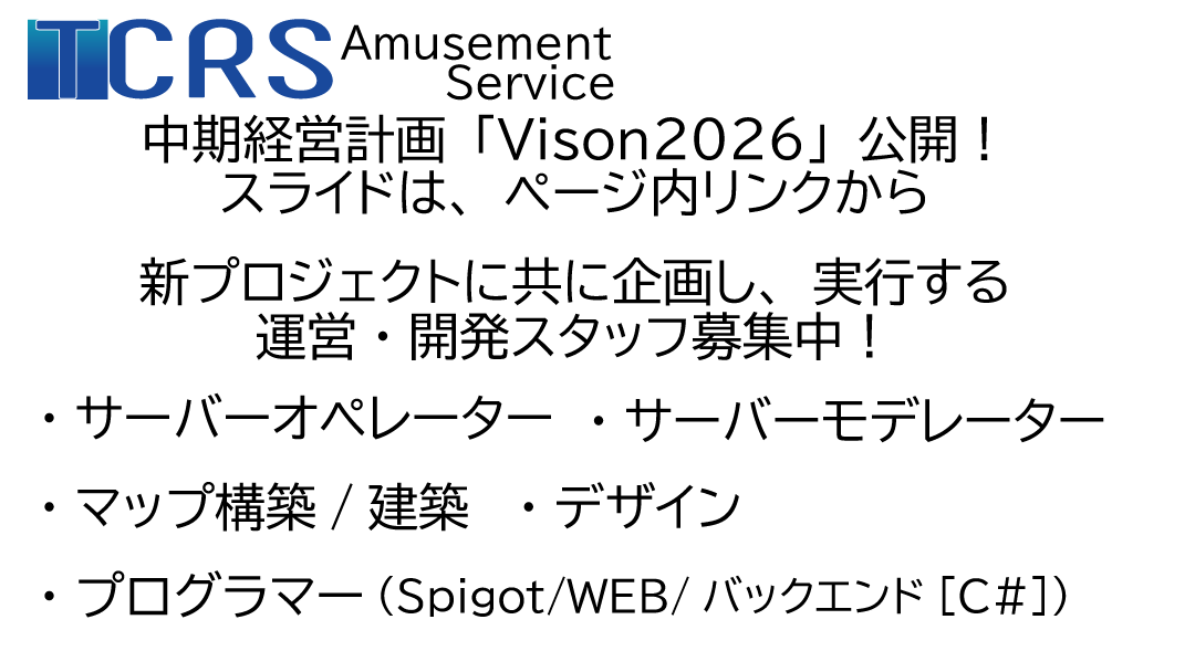 TCRS Amusement Serviceでは、中期経営計画「Vison2026」に基づいて新規サーバー構想およびオンライン・関西エリアでのリアルイベントおよび各種技術開発を計画し実行する、新規スタッフを募集しております。